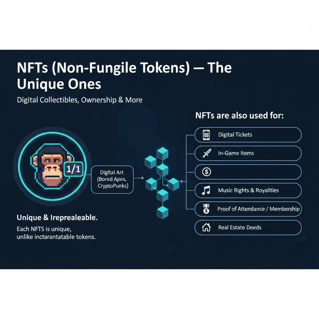 - NFT (Non-Fungible Tokens) — уникалдуулар Жогорудагы бардык токендерден айырмаланып, NFT алмаштырылбайт. Ар бири толугу менен уникалдуу, санариптик коллекциялык буюм же менчик күбөлүгү сыяктуу. Ооба, көпчүлүк NFT жөнүндө өтө кымбат санариптик искусство (Bored Apes, CryptoPunks ж.б.) аркылуу уккан, бирок бул жөн гана бир колдонуу. NFT дагы колдонулат: