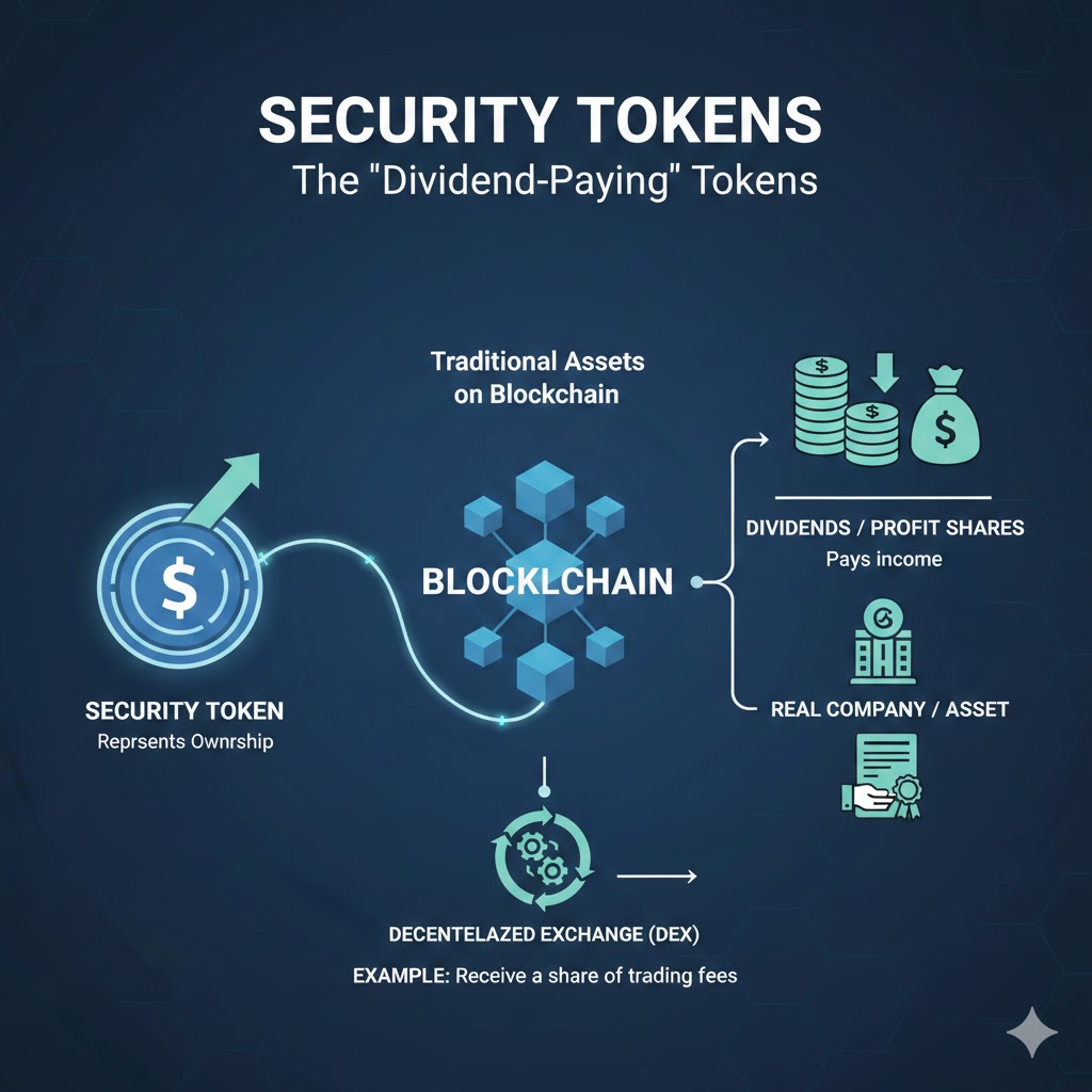 - Security-токендер — «дивиденд төлөгөн» токендер Бул салттуу акциялар же облигацияларга окшош, бирок блокчейнде. Чыныгы компаниянын же активдин үлүшүн билдирет жана дивиденддерди же пайданын үлүшүн төлөй алат. Мисал: децентралдаштырылган биржанын соода комиссияларынын үлүшүн берген токендер.