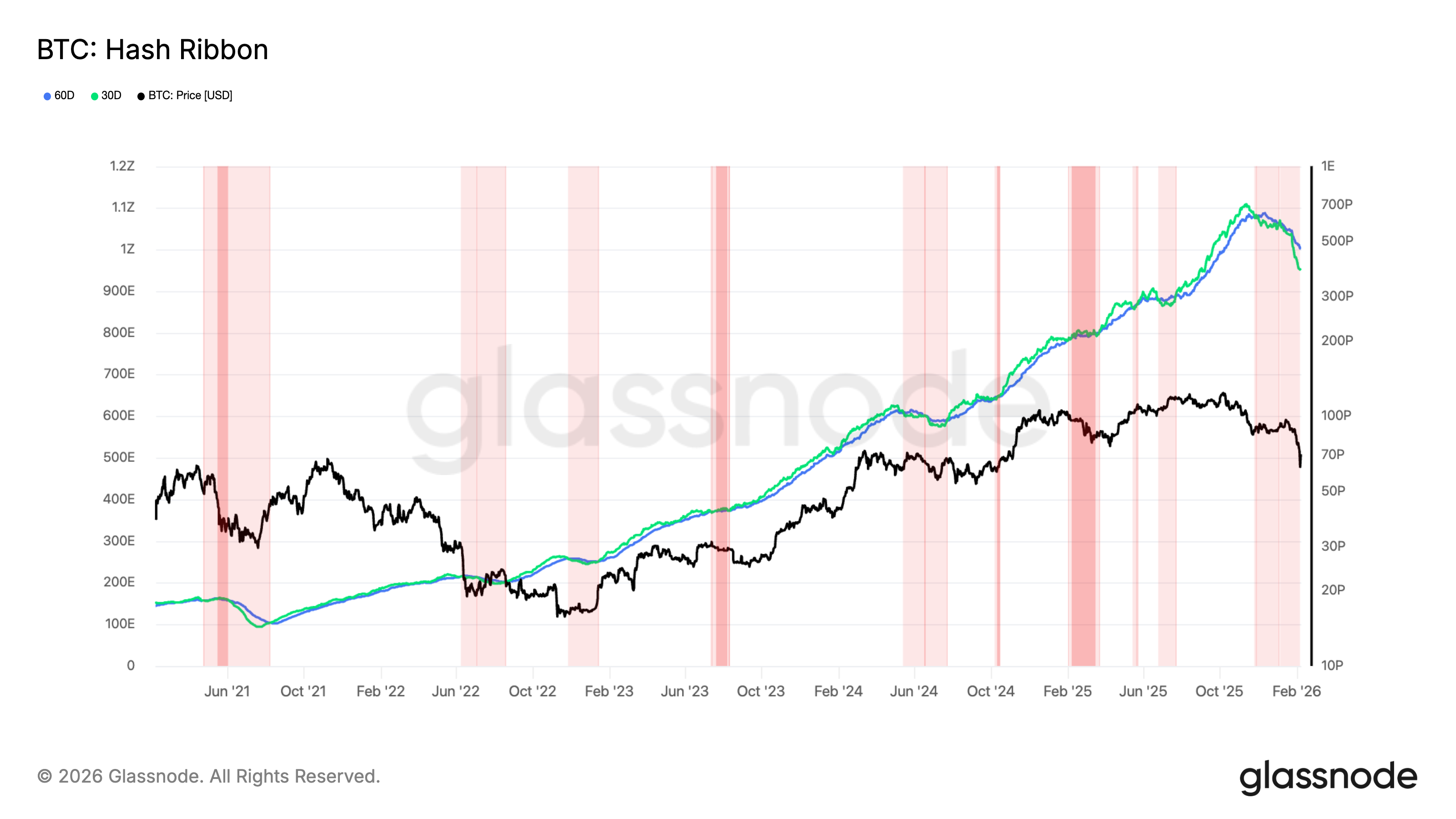 Мисалы, Riot Platforms 2025-жылдын декабрь айында дата-центрлерге кеңири фокус жарыялап, $161 млн Биткоин сатты. IREN өткөн жумада ИИ инфраструктурасына окшош өзгөрүү жасады. Hash Ribbons метрикасы да көйгөйлөрдү сигнализациялап жатат: хешрейттин 30 күндүк жылып жүрүүчү орточосу 60 күндүкүнөн төмөн кесилип өттү — бул тарыхый жактан майнерлердин капитуляция мезгилдерине жана кошумча сатуу басымына алдын ала кабар берет.